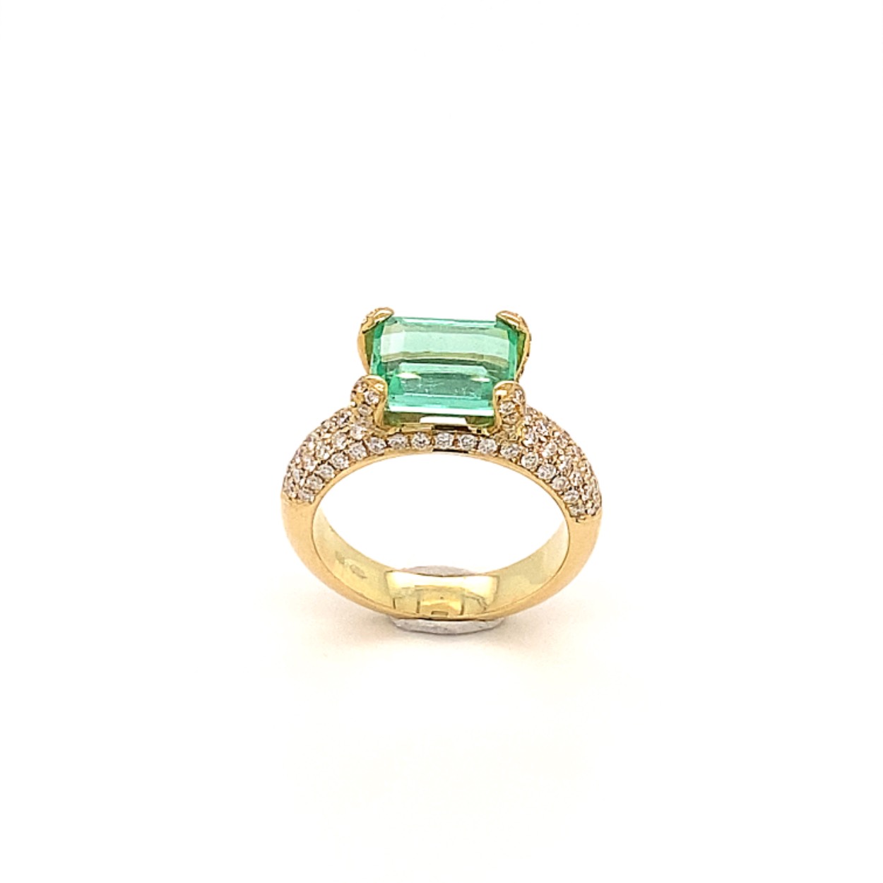 Gouden handgemaakte damesring met smaragd en diamant