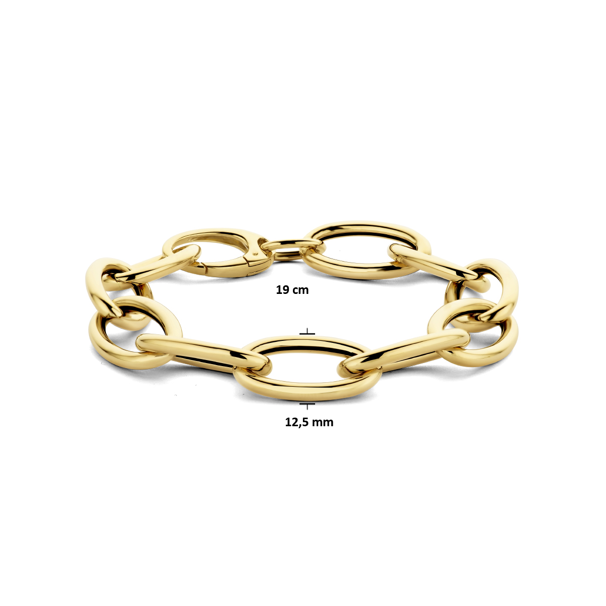 14k Geelgouden paperclip armband met een schakelbreedte van 12.5mm. De armband heeft een draaglengte van 19cm.