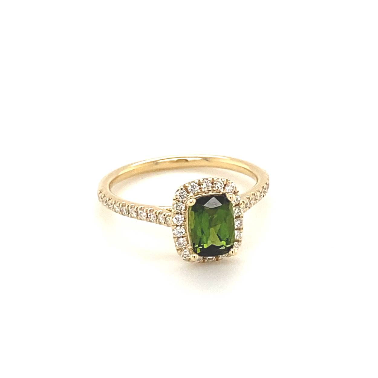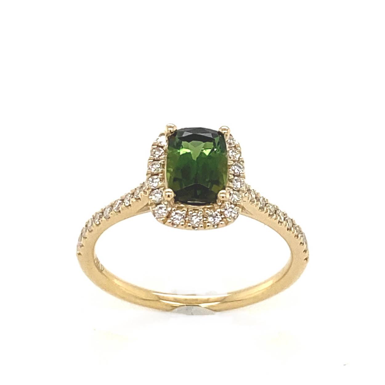 geelgouden damesring met groene tourmalijn en briljant