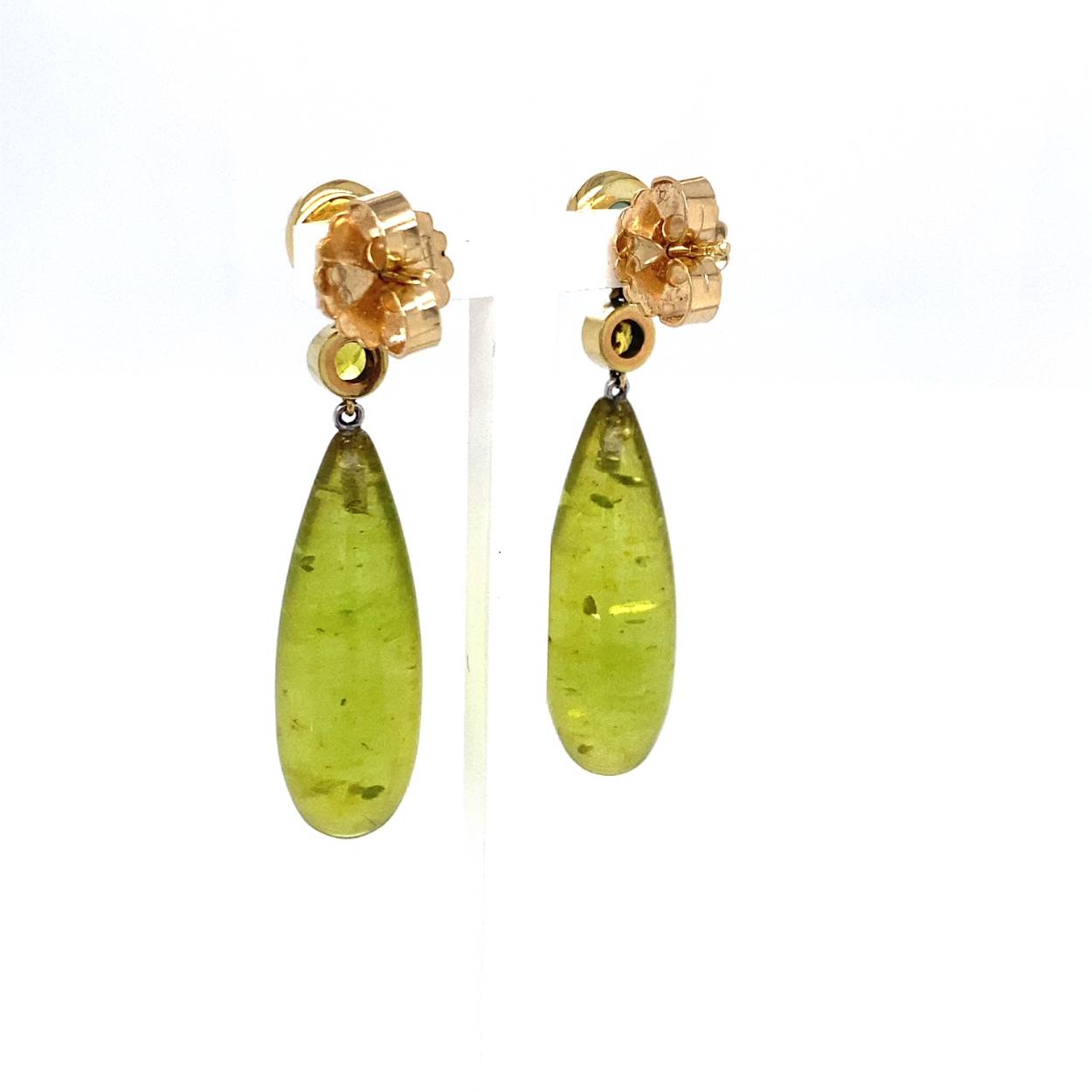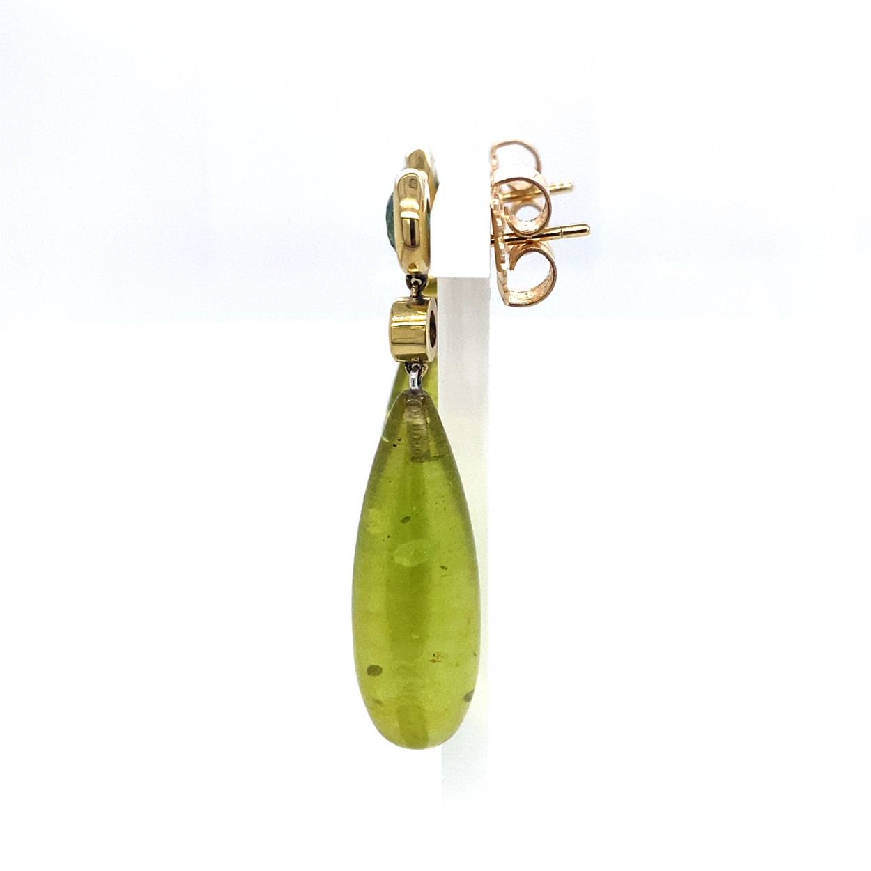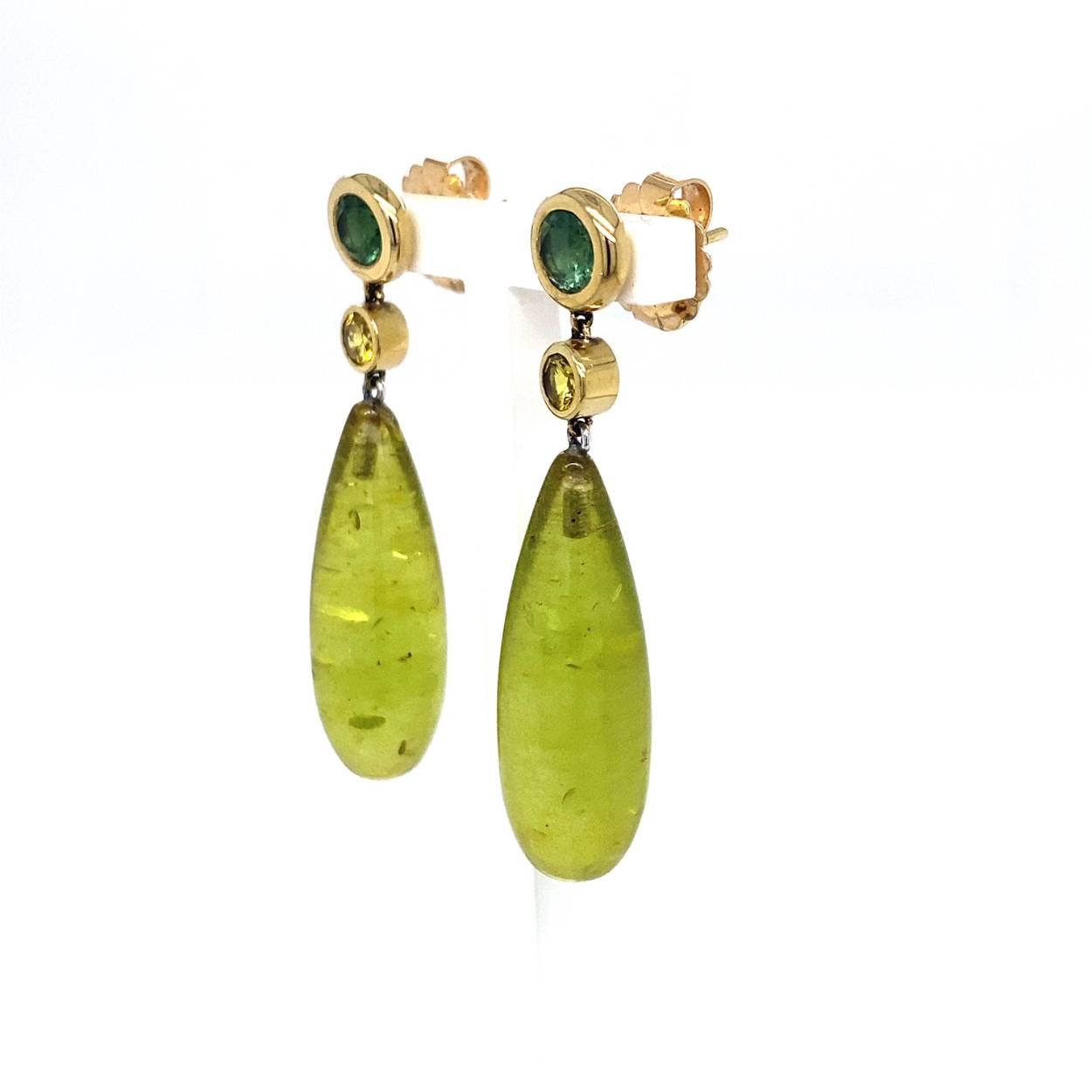 geelgouden handgemaakte oorbellen met groene en gele saffier en groen barnsteen
