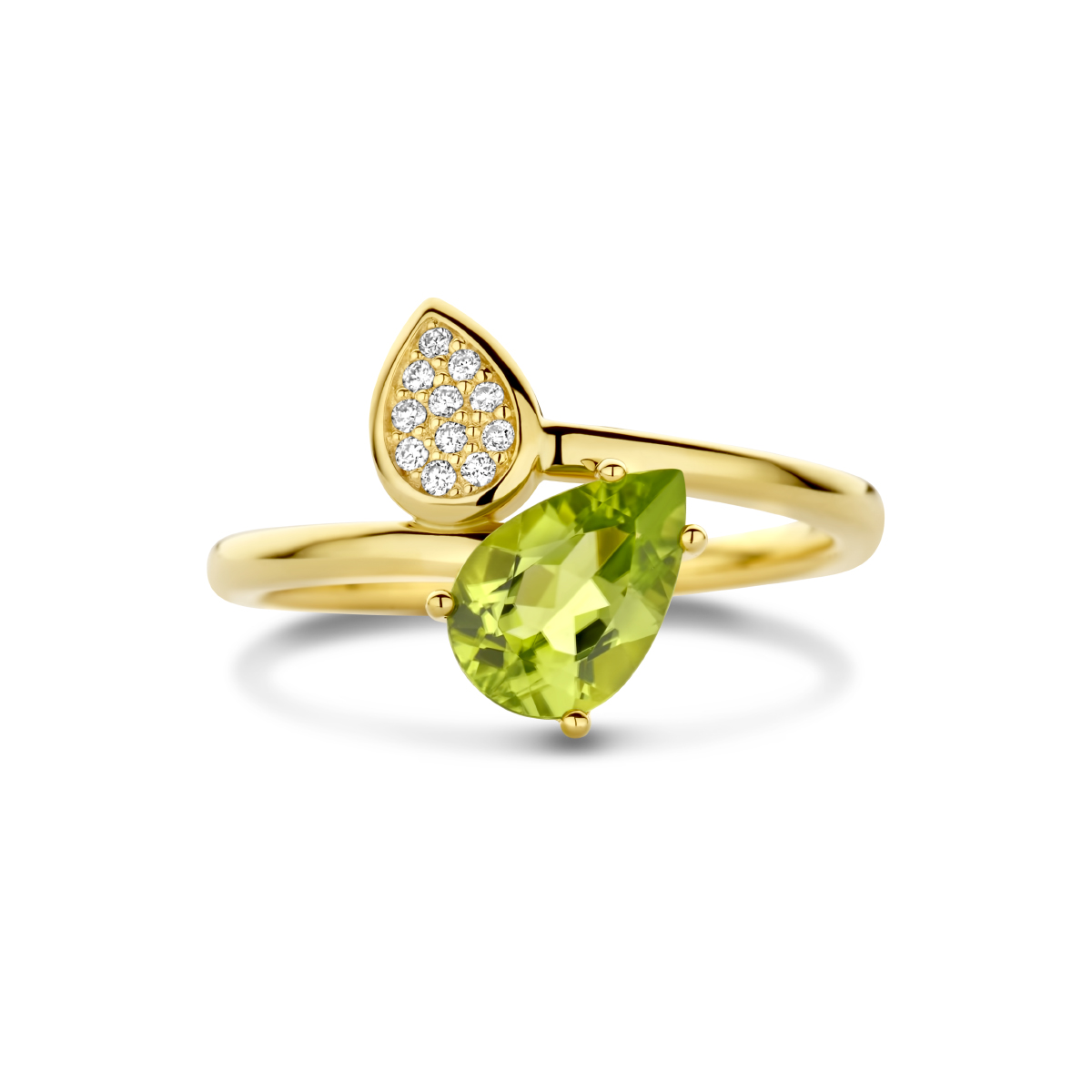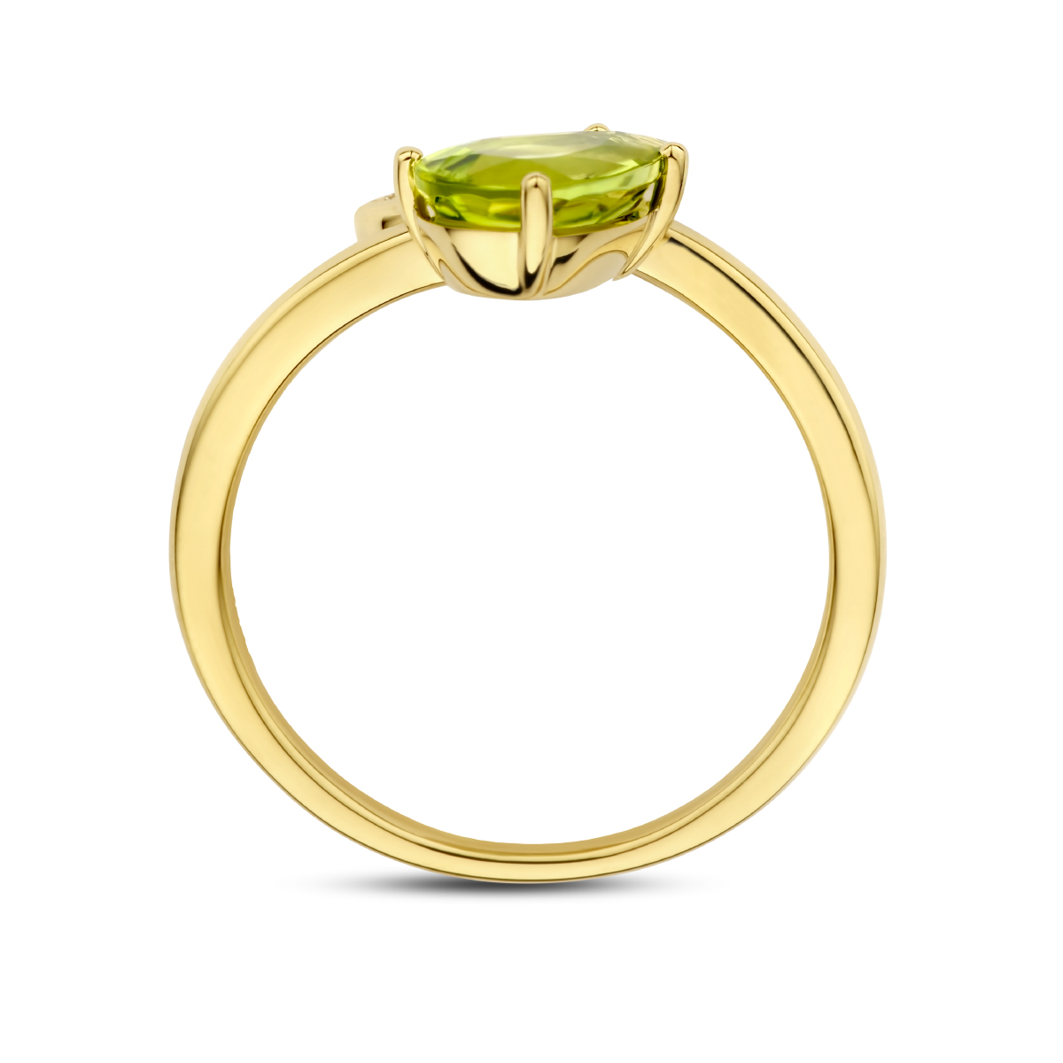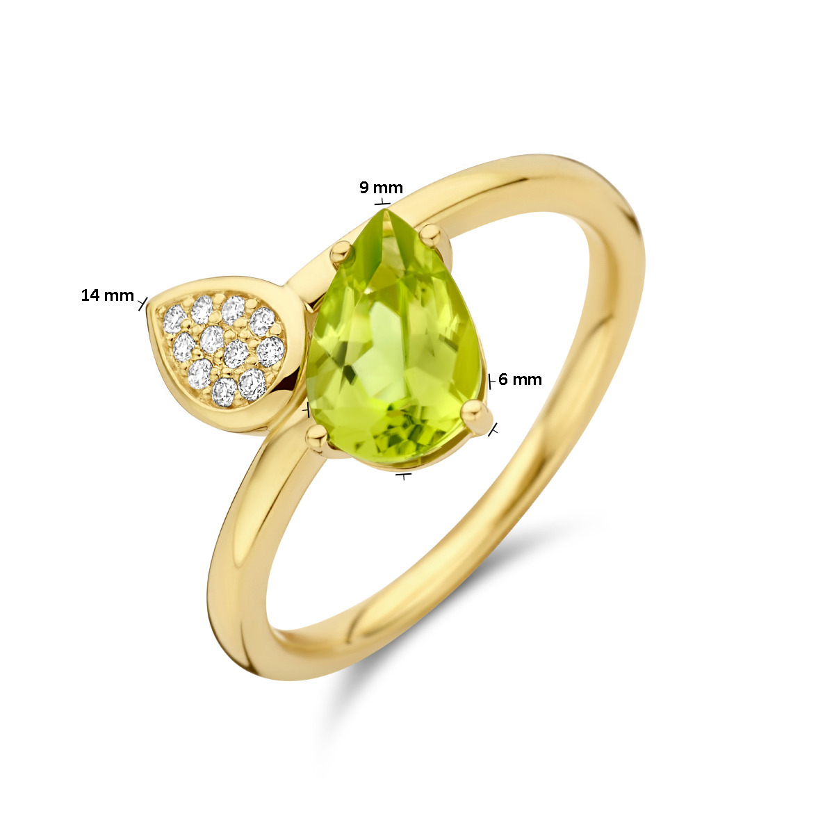 14k Geelgouden ring uitgevoerd met schitterende peridot en diamant. De ring heeft een afmeting van 14x10mm. De peridot heeft een steengewicht van 1.25ct en het diamantgewicht is 0.055ct.