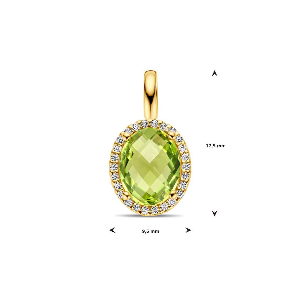 14k geelgouden hanger uitgevoerd met peridot en diamant. De hanger heeft een afmeting van 17.5x9.5mm. Het diamantgewicht is 0.09ct.