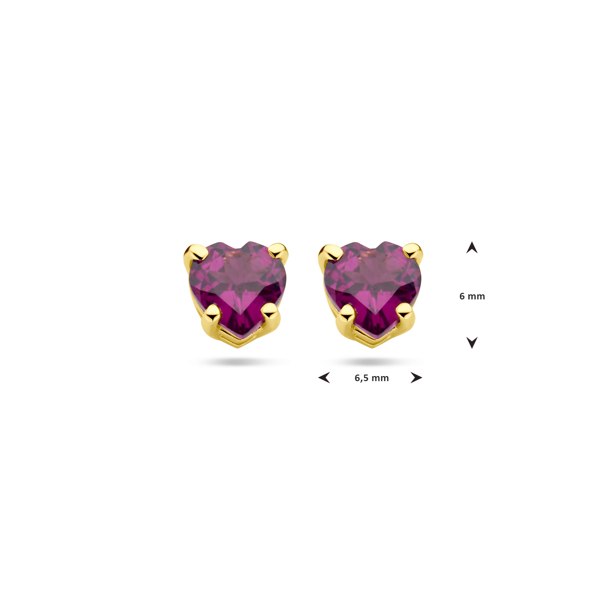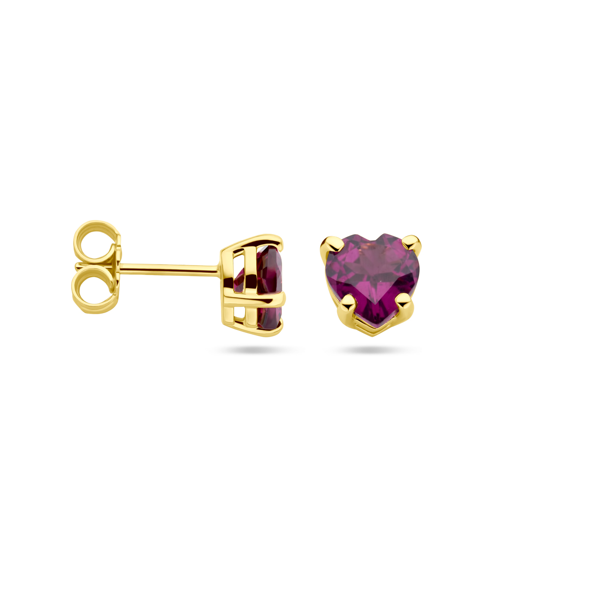 14k Geelgouden oorknoppen uitgevoerd met rhodoliet hart. De oorknoppen hebben een afmeting van 6x6.5mm.