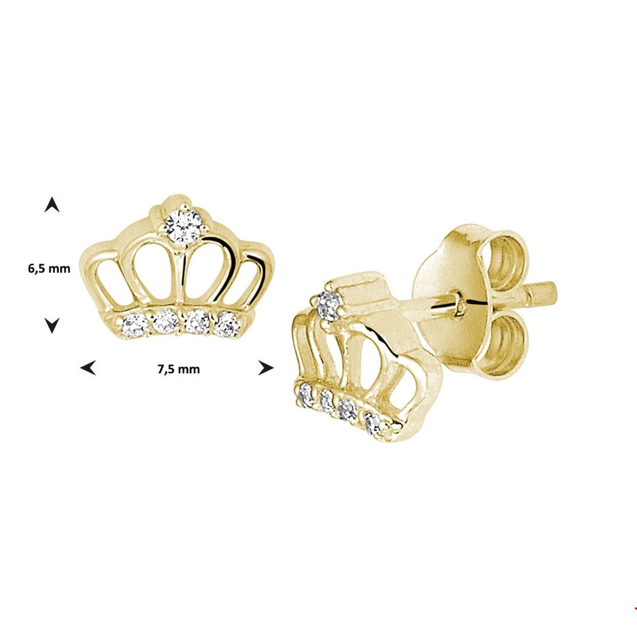 Schattige geelgouden oorknoppen in de vorm van een kroontje met een afmeting van 6.5x7.5mm. Uitgevoerd met schitterende zirkonia en een stevige poussette sluiting. Deze oorknoppen zijn perfect te combineren met bijpassende sieraden uit onze collectie. Tip: Leuk om kado te geven!