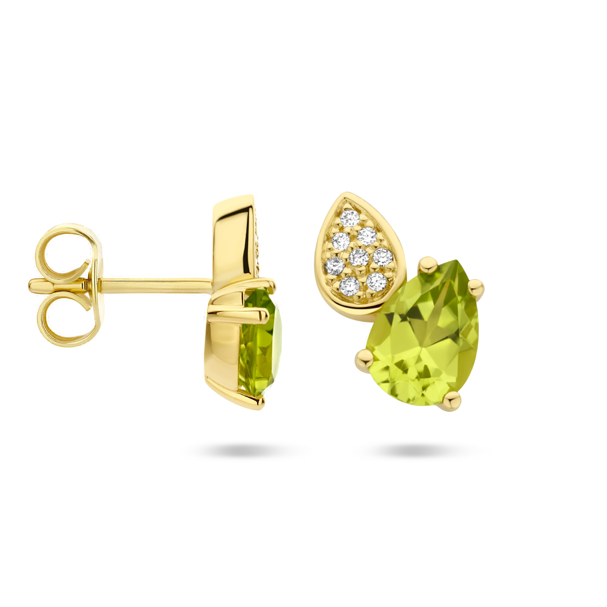 14k Geelgouden oorknoppen uitgevoerd met schitterende peridot en diamant. De oorknoppen hebben een afmeting van 11.5x7mm. De peridot heeft een steengewicht van 1.30ct (2x 0.65ct) en het diamantgewicht is 0.05ct (2x 0.025)ct.