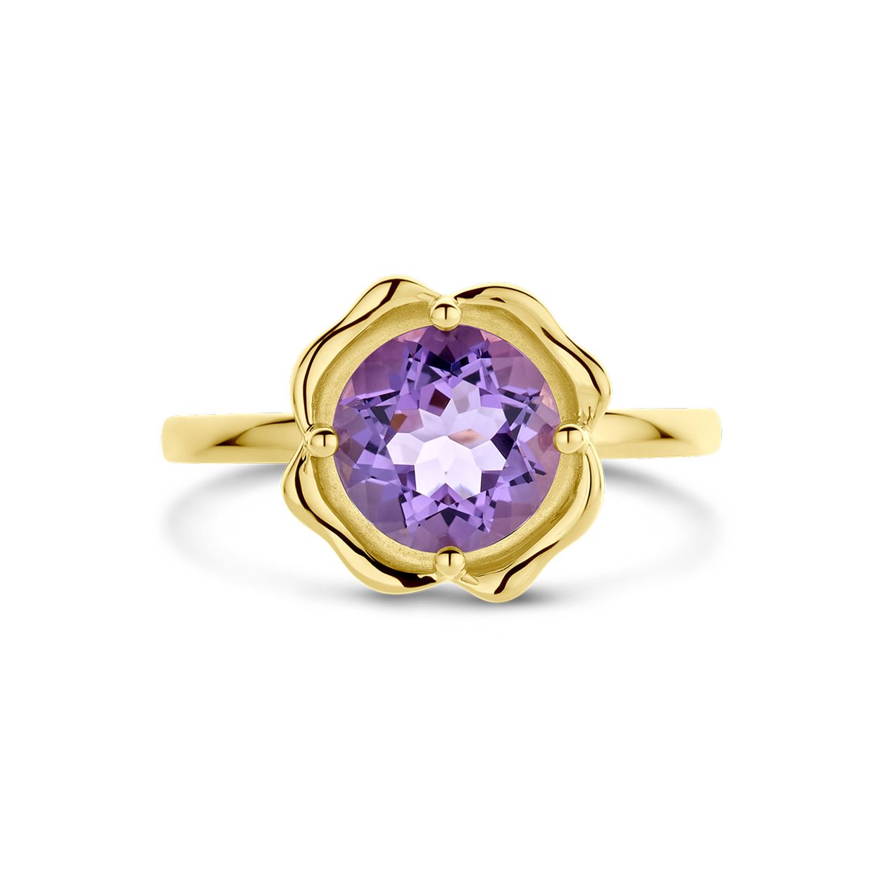 14k Geelgouden ring uitgevoerd met amethist. De steen heeft een diameter van 8mm.