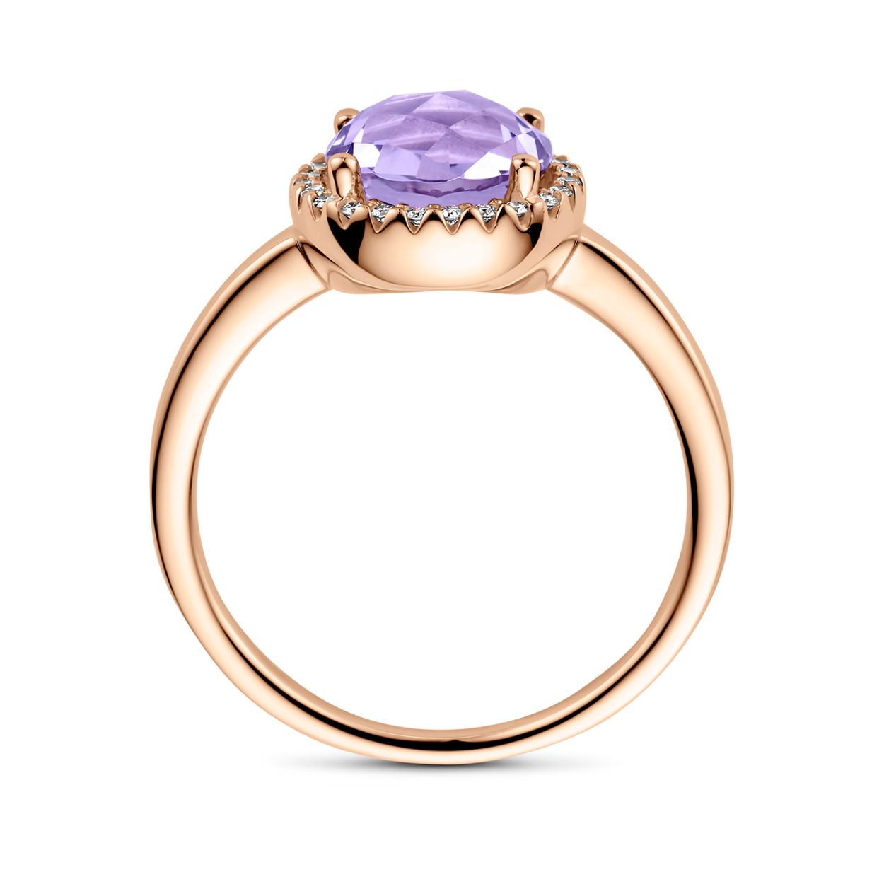 14k Roségouden ring uitgevoerd met amethist en diamant. De ring heeft een breedte van 10.5mm. Het diamantgewicht is 0.09ct.