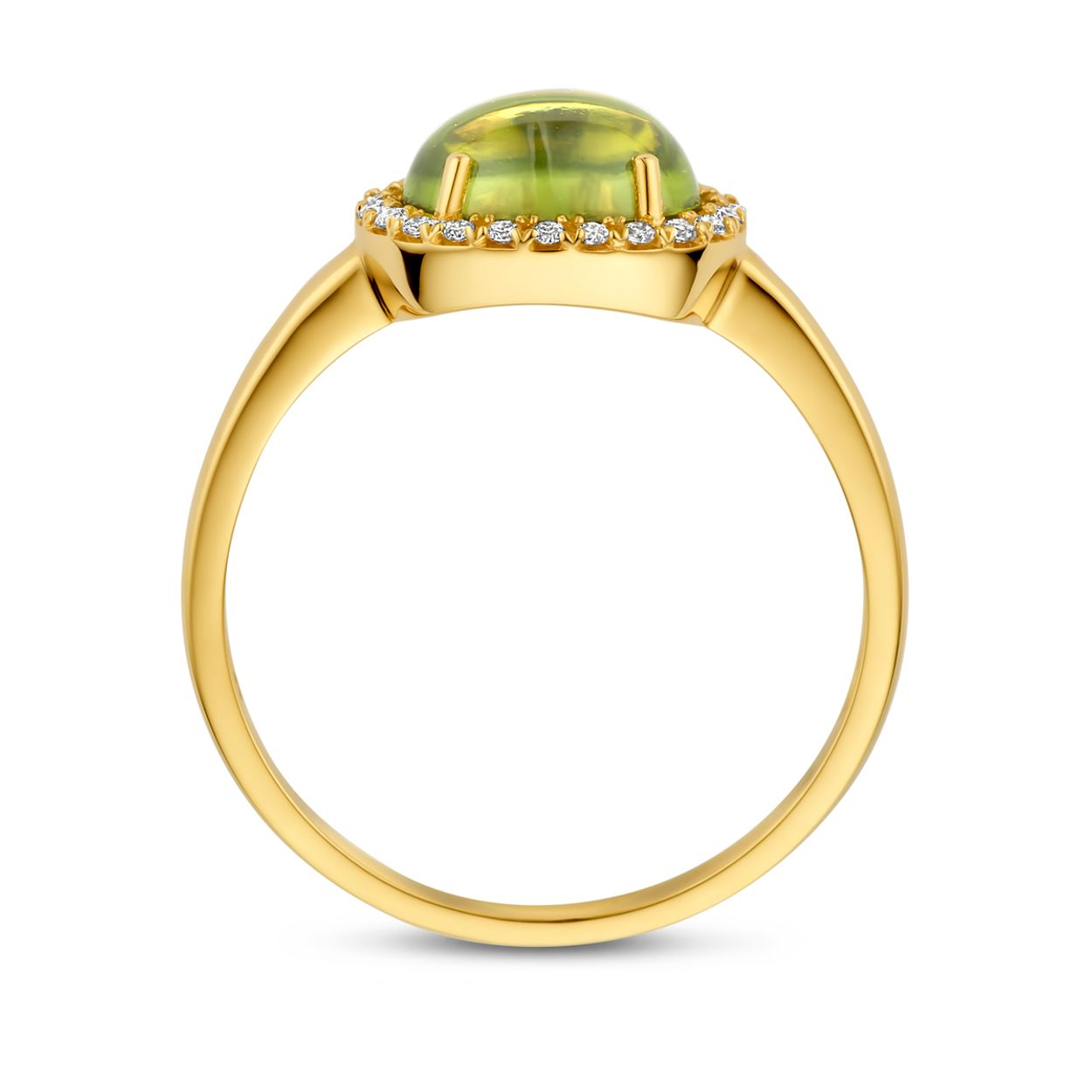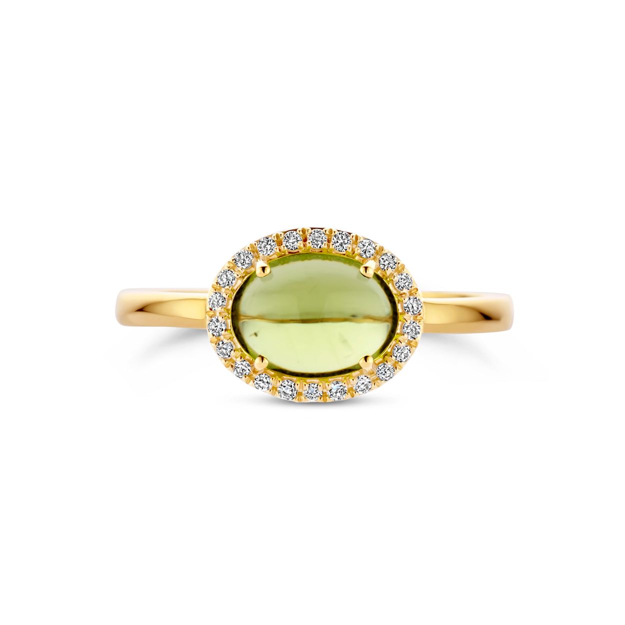 14k Geelgouden ring uitgevoerd met diamant en peridot. De ring heeft een afmeting van 8.5x10mm. De totale diamantgewicht is 0.09ct.