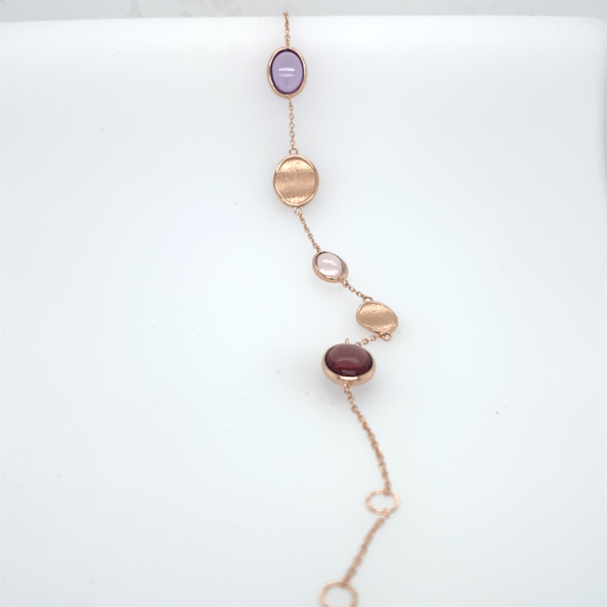 14 krt rosé gouden armband met rhodoliet en amethist en rose kwarts