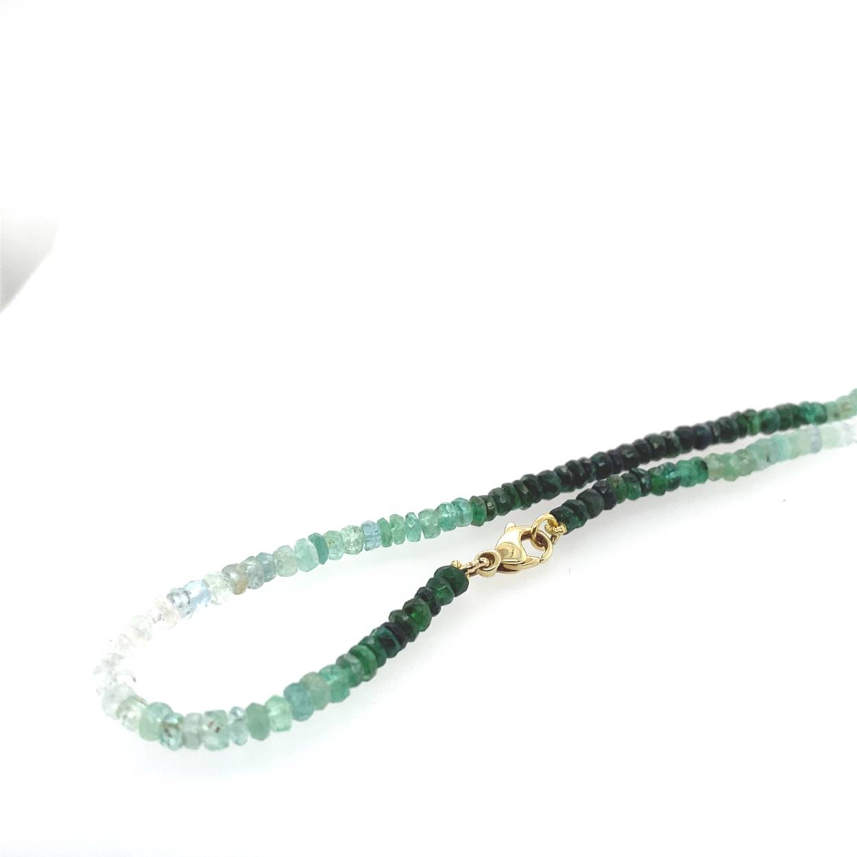 smaragd collier aflopend in kleur gesloten door een gouden karabijnhaak